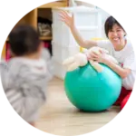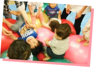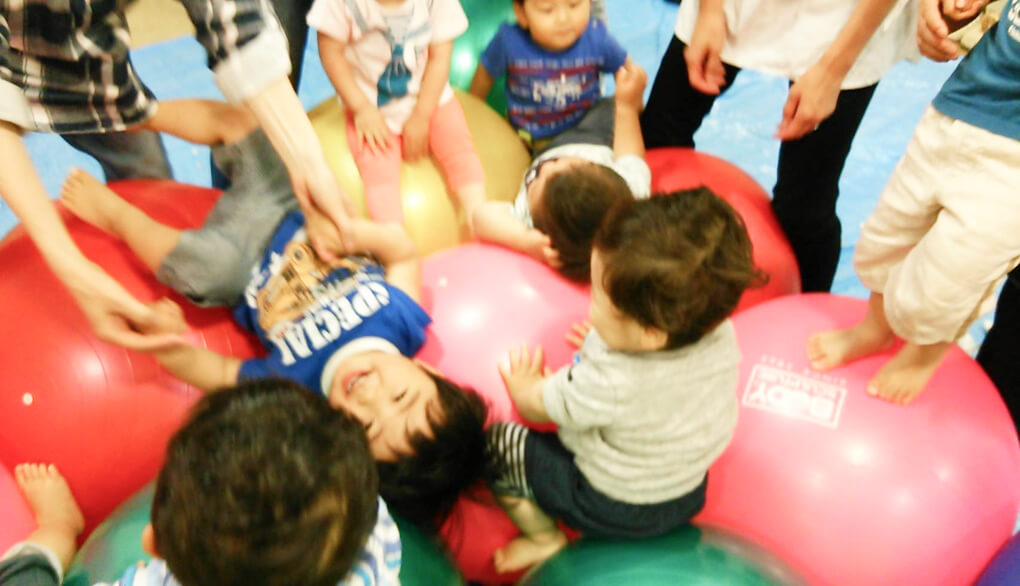 乳幼児期にほとんど重要視されていない、神経系発達のために不可欠な抗重力姿勢と3つの体性感覚 の入力を、バランスボールの特性を使って、5つの歌にあわせて行います。